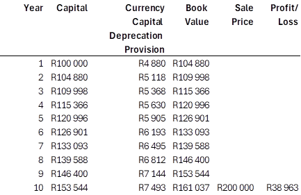 Every year a currency capital depreciation provision is raised. At the end of the 10-year period the book value is R161 037. The R161 037 is what needs to be spent to acquire the same asset 10 years later, but the market value is R200 000. The difference is R38 963 which is the income for tax purposes, not R100 000. In many cases there will in fact not be any profit since the book value and market value would be the same. In this case there is thus no income and no taxation. In this case we end up in the correct common-law position. Capital is not taxed.